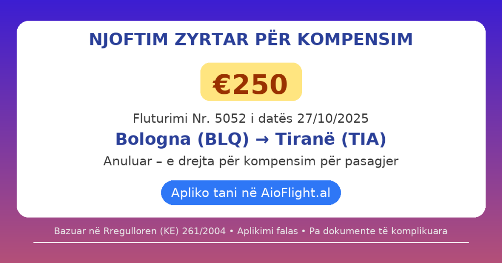 Fluturimi juaj është anuluar në momentin e fundit dhe nuk e dini çfarë hapash duhet të ndërmerrni? Ju mund të keni të drejtën për të përfituar kompensim sipas rregullores së Bashkimit Evropian EC 261/2004, e cila mbron të drejtat e pasagjerëve ajrorë.